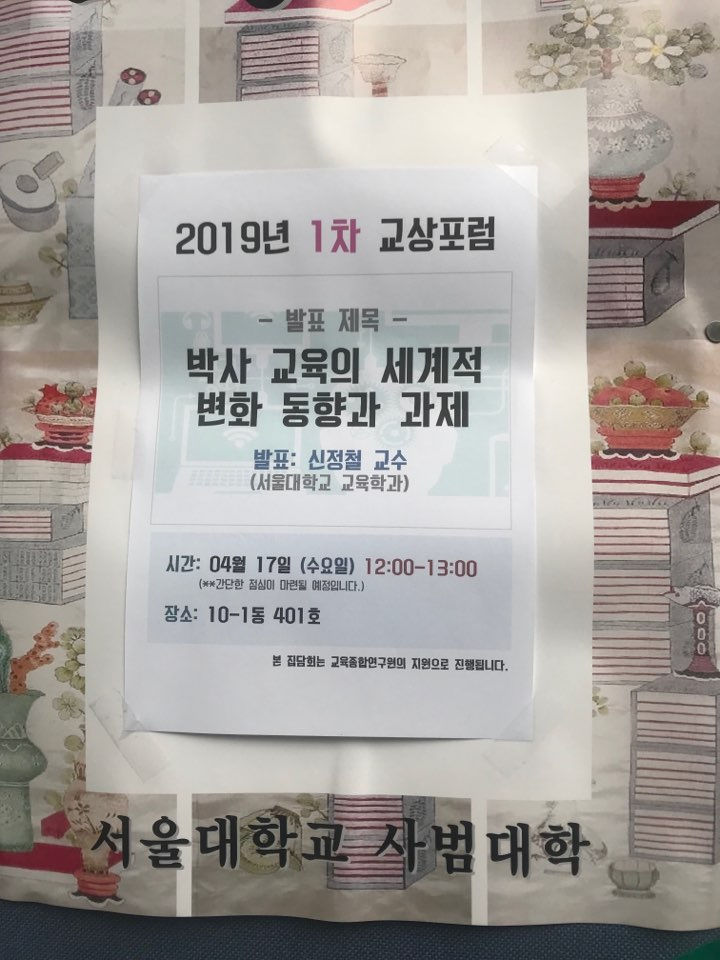 2019년 1차 교상포럼을 다음과 같이 안내합니다.●일시: 2019년 4월 17일 (수) 12:00-13:00●장소: 사범대학 10-1동 401호●제목: 박사 교육의 세계적 변화 동향과 과제 - 발표: 신정철 교수님 (서울대 교육학과) * 간단한 점심이 제공됩니다. ** 본 행사는 교육종합연구원의 지원으로 진행됩니다.